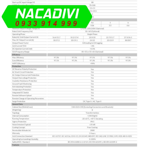 | Lưới điện quy định | IEC 61727, IEC 62116, EN 50549, NRS 097, RD 140, UNE 217002, G99 |